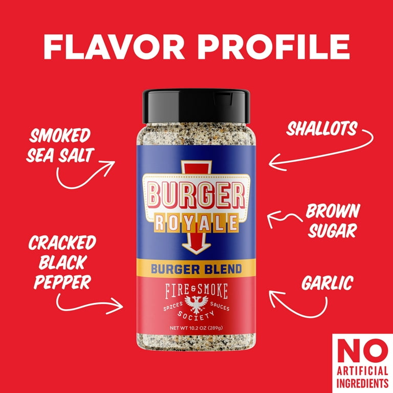 The Fire & Smoke Society presents the Burger Royale Blend meat seasoning salt, a 10.2-ounce fusion of sweet and savory. With brown sugar, smoked sea salt, garlic, shallots, and cracked black pepper, it enhances any dish dubbed 'Patty'.