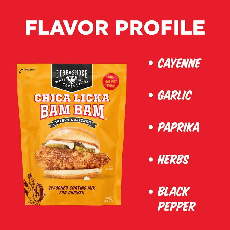 Get ready to elevate your fried chicken game with Fire & Smoke Society crispy coated Chica Licka Bam Bam chicken flour. Unlock a realm of flavor by using it to coat a batch of Buffalo cauliflower, delivering a mouthwatering experience beyond compare. We've got your chicken sando right here. Our signature chicken seasoning creates a Bam Bam batter that's perfect for restaurant-style sandwiches, tenders, and any boneless cutlet.