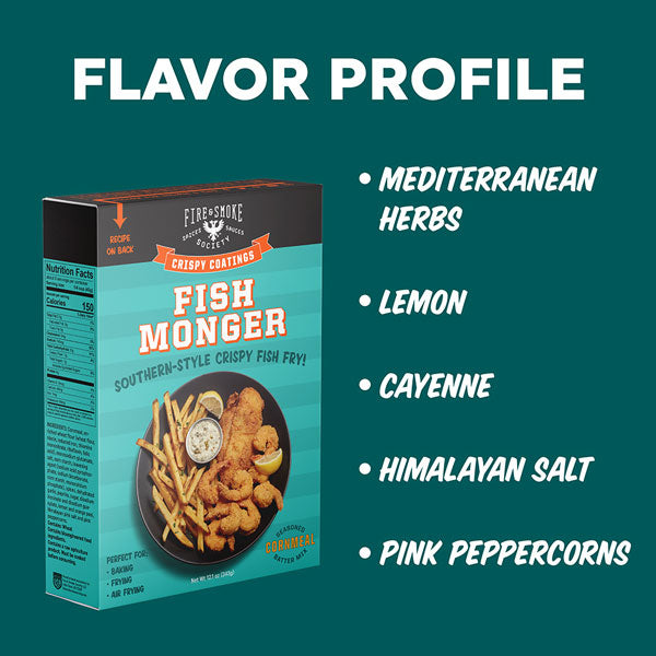 Get ready to elevate your seafood game with Fire & Smoke Society Fish monger fry seasoning mix. Indulge in a taste of the South with this delightful batter. Tailor-made for Gulf shrimp, fried fish, fish fries, onion rings, and even oysters by the dozen. Craving a po' boy night? Look no further! Elevate your culinary experience with the quintessential Southern-style crispy fish fry. This versatile fish seasoning isn't just limited to frying; it's also an excellent choice for baking or air frying. Discover the perfect blend of flavors and textures for a truly authentic Southern feast. Comes in a 12.1 oz bag.
